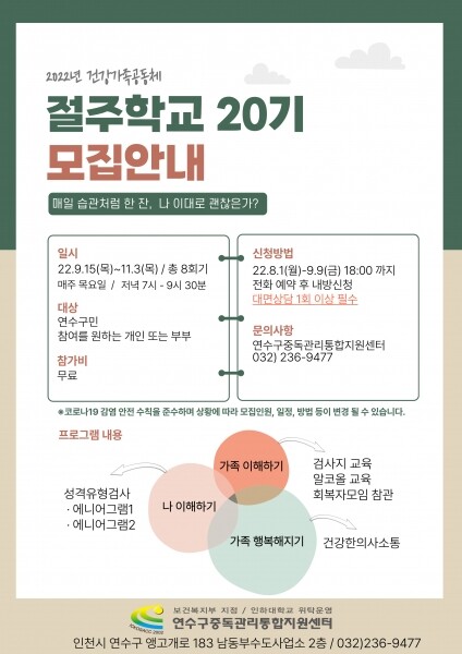 신청은 9월 9일까지 전화 예약 후 내방하면 되며 기타 자세한 사항은 연수구 중독관리통합지원센터 홈페이지에서 확인하거나 전화로 문의하면 된다.