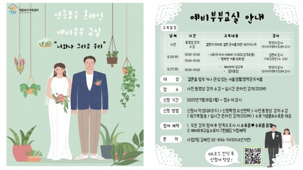예비부부교실과 관련된 자세한 사항은 영등포구청 홈페이지의 우리구소식에서 확인하거나 영등포구가족센터로 문의하면 된다.