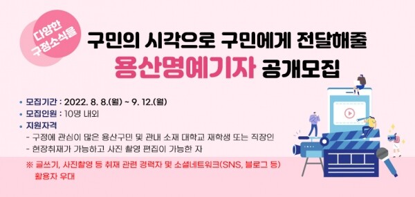 구는 기사의 적합성, 참신성, 전달력, 표현력, 완성도 등을 심사해 9월 중 최종 선발 결과를 발표하고 위촉장, 명예기자증을 전달할 방침이다.