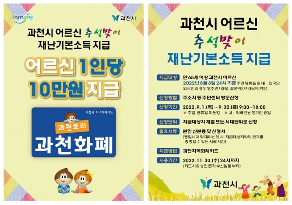 지급대상은 2022년 8월 8일 24시 기준, 과천시에 주민등록을 둔 만 65세 이상 어르신으로 9월 1일부터 9월 30일까지 주소지 동주민센터로 신분증을 지참해 본인이 방문 신청하면 된다.