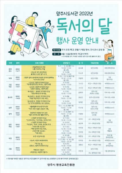 이번 독서의 달 행사는 시민들이 독서에 대한 흥미를 느끼고 책 읽는 문화를 확산시키기 위해 양주시 관내 도서관 9개소에서 온·오프라인 방식으로 진행된다.