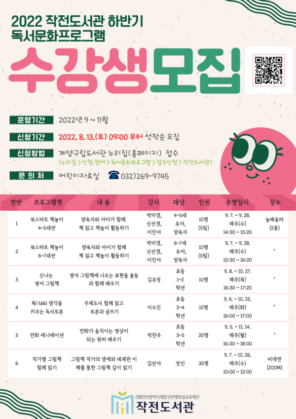 이번 하반기에는 오는 9월 5일부터 프로그램별 개강해 11월 14일까지 유아와 성인 등을 대상으로 총 6개의 프로그램을 운영한다.