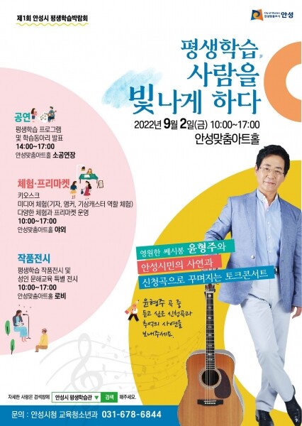 특히 영원한 세시봉 윤형주와 시민의 사연과 신청곡으로 꾸며지는 평생학습 시민참여를 위한 토크콘서트를 기획했으며 윤형주 선생님의 음악이 흘러나오던 그때 그 시절, 추억의 사연을 사전 신청 접수 받으며 신청기한은 8월 26일까지 제출하면 된다.