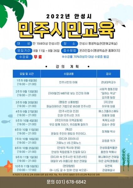 민주시민교육은 만 19세이상 안성시민을 대상으로 하며 9월 6일부터 매주 화요일에 안성시 평생학습관에서 진행된다.