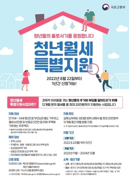 청년 월세 한시 특별지원사업은 코로나19 장기화로 인한 경제 상황 악화가 청년들의 고용 여건에 부정적으로 작용해 경제적 어려움을 겪고 있는 청년층의 주거비 부담 경감을 위해 12개월분의 월세를 매월 최대 20만원까지 지원하는 사업이다.