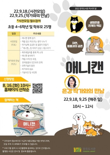 해당 프로그램은 9월 18일 사전모임, 9월 25일 작가 강연회를 진행해 생명존중과 관계의 책임, 자연과 인간의 공존에 대한 대화의 장을 마련함으로써 사고의 확장을 돕고 동화작가에 대해 평소 궁금했던 점을 나누는 시간을 갖는다.