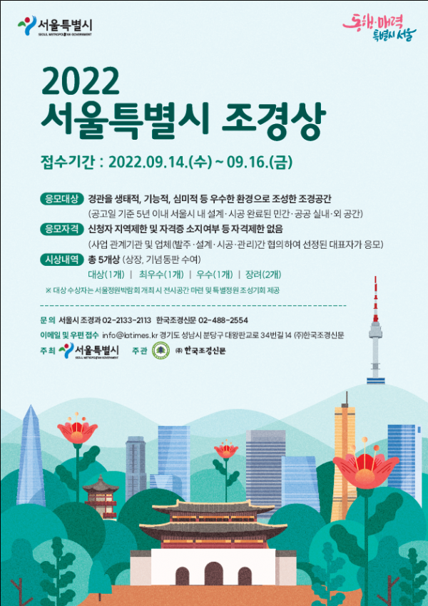올해 처음으로 추진하는 ‘서울특별시조경상’은 뛰어난 우수 조경공간을 선정·시상해 조경 분야의 발전을 도모하고 서울을 더 품격있는 녹지생태도시로 나아가기 위한 것으로 선정된 5개 공간에는 ‘서울특별시장상’이 수여된다.