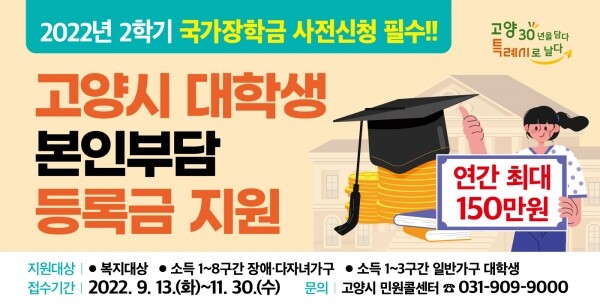 고양시는 대학생들의 실질적인 교육비 경감과 학자금 대출 부담을 완화하기 위해 ‘고양시 대학생 본인부담 등록금 지원 조례’에 따라 작년부터 등록금을 지원하고 있다.