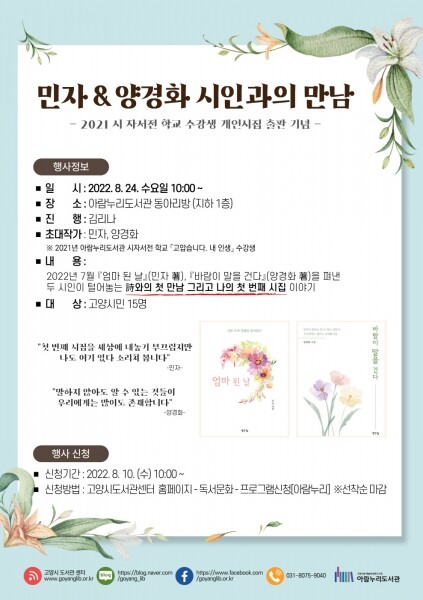 이번 북토크는 도서관 프로그램 참여를 통해 책을 펴낸 두 고양시민의 출판을 기념해 두 시인을 초청해 ‘시와의 첫 만남 그리고 첫 번째 시집 이야기’를 시민과 공유한다.