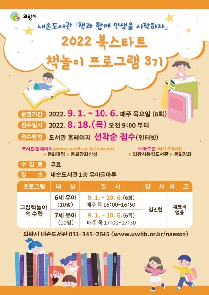 9월 1일부터 매주 목요일 6회에 걸쳐 운영하는 이번 3기 프로그램은 ‘그림책놀이 속 수학’을 주제로 수학 원리를 체험하기 위한 그림책 읽기 및 독후활동 등을 제공한다.