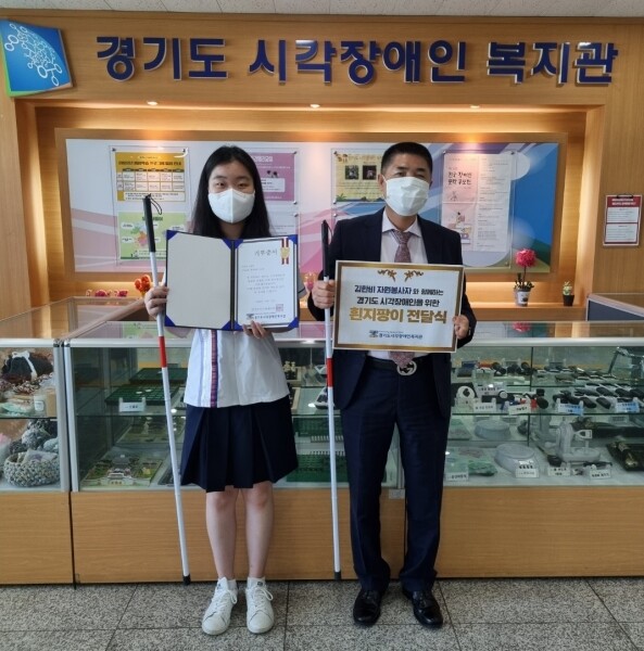 앞서 김한비 학생은, 지난 2019년 3월부터 양주시에 거주하는 시각장애인 참여자에게 월 2회 안부전화 자원봉사활동을 진행함과 동시에, 2020년 8월 흰지팡이 81개 기부에 이어 올해도 흰지팡이 100개를 기부해 선한 영향력을 펼쳤다.