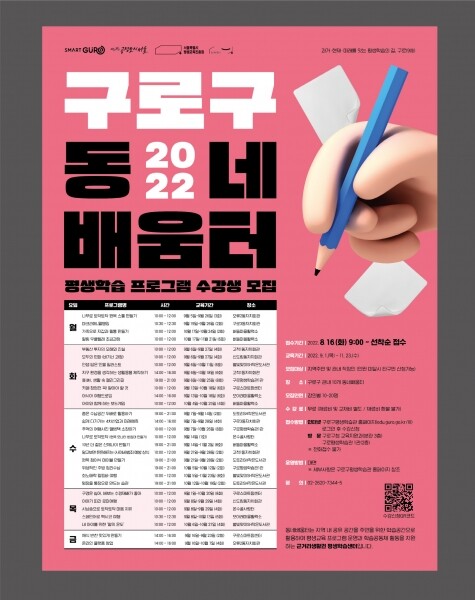 신청은 이달 16일부터 구청 교육지원과 또는 구로평생학습관 1관을 방문하거나 구로평생학습관 홈페이지에 로그인 후 할 수 있으며 선착순 마감된다.