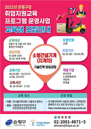 소형건설기계 기술인력 양성과정은 상반기에 진행한 이모티콘 캐릭터 디자인 전문가 양성과정과 가전설치 엔지니어 양성과정에 이은 세 번째 은평구 취업지원 교육 프로그램이다.