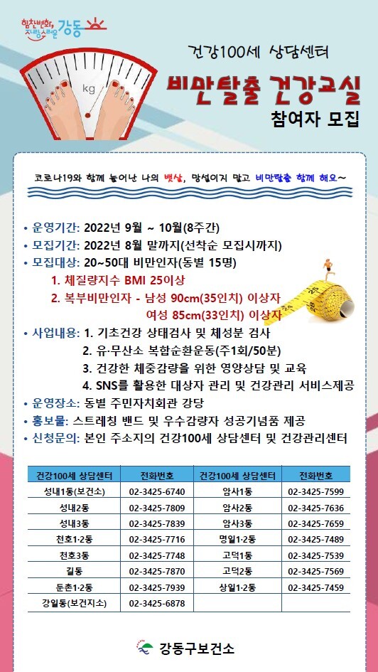자세한 사항은 강동구보건소 보건의료과 또는 가까운 동주민센터 내 건강100세 상담센터, 보건소 및 강일보건지소 건강관리센터로 문의하면 안내받을 수 있다.