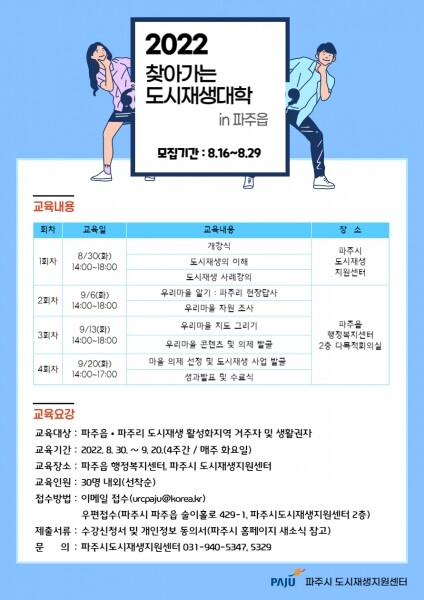 교육은 8월 30일부터 9월 20일까지 매주 화요일에 실시되며 1회차에는 파주시 도시재생지원센터에서 2회차부터 파주읍 행정복지센터 2층 다목적회의실에서 진행된다.