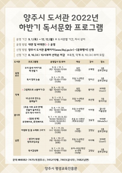 하반기 독서문화 프로그램은 옥정호수도서관, 덕계도서관, 꿈나무도서관, 남면도서관, 광적도서관, 장흥작은도서관, 양주희망도서관, 고읍도서관, 덕정도서관 등 9개 도서관에서 운영하며 총 20개 강좌로 구성됐다.