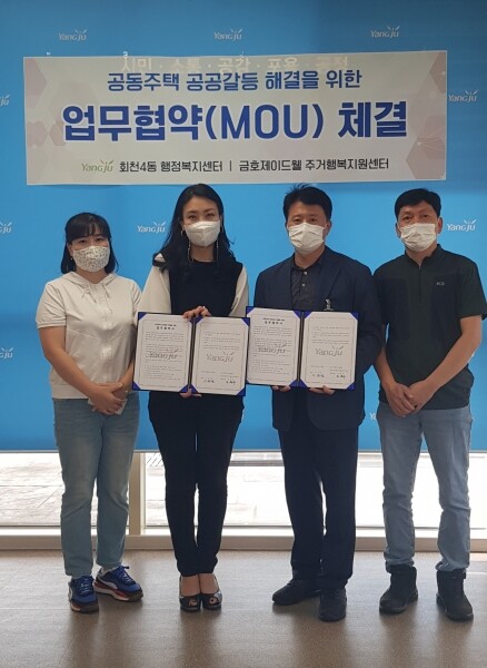 ‘살金살金 행복마을’이란 사업명으로 관내 금호제이드웰NHF와 양주옥정 천년나무16단지 2개 단지를 시범 선정, 아파트 관리주체와 주민대표, 회천4동행정복지센터가 공공갈등 해결을 위해 머리를 맞대어 수회에 걸친 워크숍을 진행하는 등 사업을 추진해 왔다.