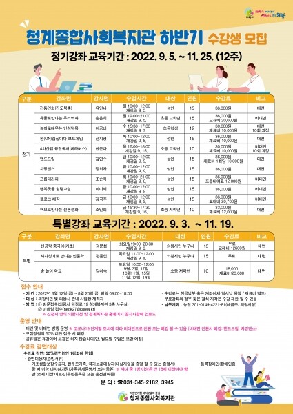접수는 의왕시민 및 관내 사업장 재직자를 대상으로 오는 8월 26일까지 방문 및 담당자 이메일로 신청할 수 있으며 기타 자세한 사항은 의왕시청 및 청계종합사회복지관 홈페이지 공지사항을 참고하면 된다.