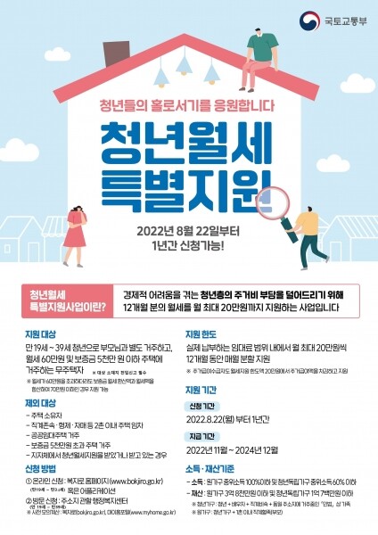 신청은 오는 8월 22일부터 내년 8월 21일까지 1년간 가능하며 월세 지원은 심사후 올해 11월부터 시작된다.