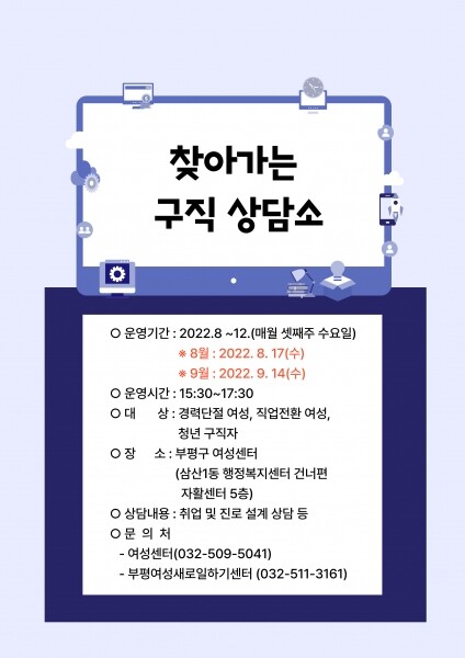 부평구 여성센터 관계자는 “이번 구직상담소를 통해 결혼·육아·가사로 꿈을 포기했던 여성들이 다시 시작 할 수 있는 발판을 제공할 것”이라고 말했다.
