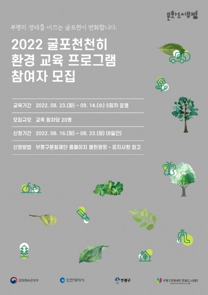 부평구 문화도시센터 관계자는 “굴포천 환경 프로젝트인 ‘굴포 천천히’ 사업을 통해 굴포천과 도시환경에 대해 시민들이 생생하게 체감할 수 있는 시간이 되길 바란다”고 말했다.