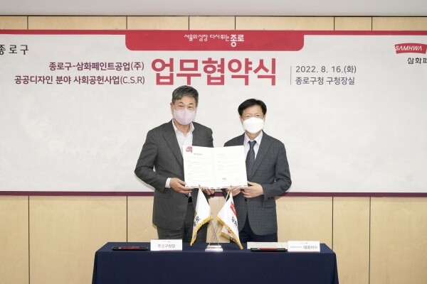 이날 협약식에서 종로구와 삼화페인트는 공공디자인의 가치를 높이고 삼화페인트 C.S.R 사업을 바탕으로 지역사회 발전을 위해 함께하기로 약속했다.
