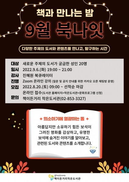 8월 20일 오전 9시부터 금천구립도서관 홈페이지 ‘작은도서관-문화프로그램 신청’에서 접수할 수 있다.