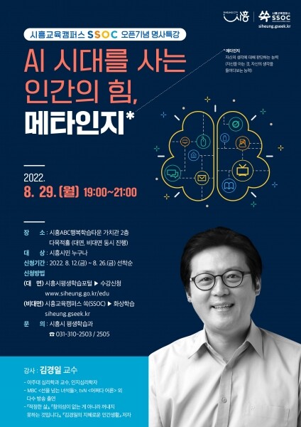 오는 29일 월요일 저녁 7시부터 진행되는 명사 특강은 김경일 아주대학교 심리학과 교수가 강의자로 나서 ‘AI 시대를 사는 인간의 힘, 메타인지’를 주제로 강의를 펼친다.