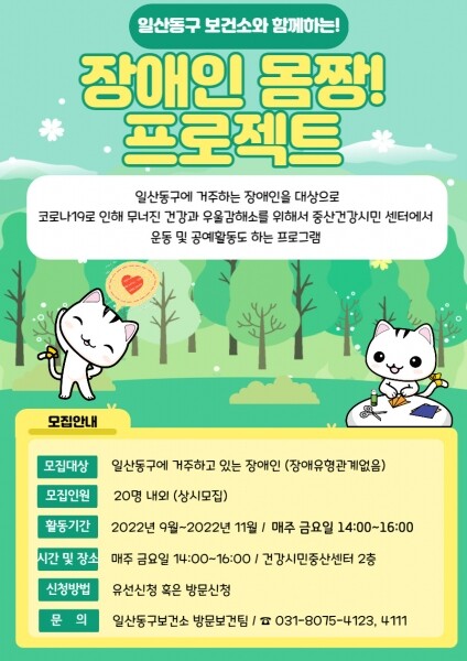 [뉴스써치] 고양특례시 일산동구보건소가 장애인 건강증진을 위해 2022년 장애인 재활·운동 프로그램 ‘장애인 몸짱 만들기 프로젝트’ 신규 대상자를 모집한다.
