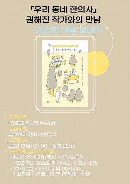 권예자 중앙도서관장은 “이번 작가와의 만남을 통해 시민들이 지치기 쉬운 여름철 건강을 잘 관리하고 건강하게 가을을 맞이하길 바란다”고 말했다.