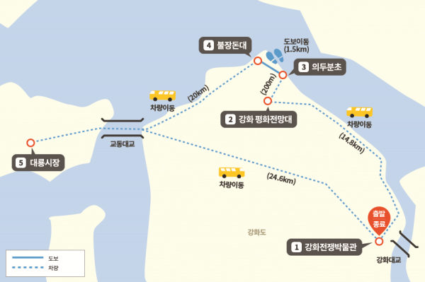 그중 강화군 노선은 ‘강화전쟁박물관 → 강화평화전망대 → 의두분초 → 철책선 도보길 → 불장돈대 → 대룡시장’을 둘러보는 코스다.