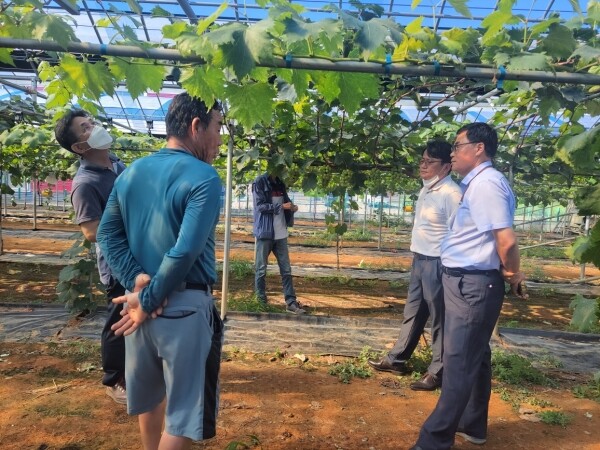 수확기를 앞둔 포도 과원을 찾은 최을수 원예기술팀장은 비닐멀칭을 거둬내고 주기적으로 물관리를 해야 잎 갈변 및 열과 등을 예방할 수 있다고 강조했고 최상호 센터장은 이후에도 폭우 및 태풍 등의 기상재해가 우려되는 만큼 지도기관에서 대처 방안을 사전에 지도해 피해를 최소화해 줄 것을 당부했다.