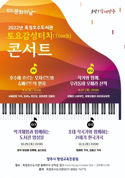 시 도서관 관계자는 “이번 토요감성터치 콘서트는 문화의 날을 맞은 시민 누구나 평등하게 문화를 향유할 수 있도록 마련한 것으로 코로나 시대 지역 연주자와 함께하는 감성과 치료의 행사로 다가가길 바란다”고 전했다.