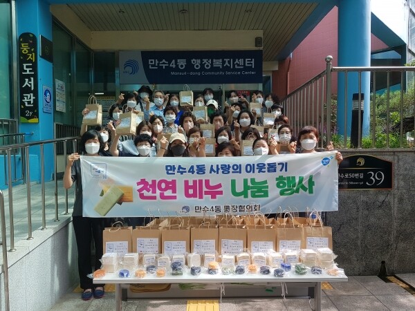 [뉴스써치] 인천시 남동구 만수4동 행정복지센터는 최근 통장협의회 공동체 소모임 ‘비누꽃 사랑나무’가 320여 개의 EM 세탁비누 및 천연 미용 비누를 만들어 홀몸 어르신 80명에게 전달했다고 18일 밝혔다.