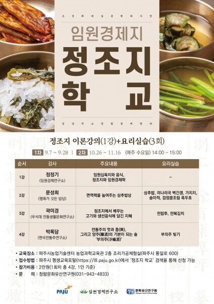 ‘정조지 학교’는 파주 장단 출신 대학자 풍석 서유구 선생의 실용백과사전인 ‘임원경제지’를 대중들에게 널리 알리고자 기획한 2022 임원경제지 학교의 일환으로 강의와 요리실습 4강으로 구성되며 최고의 정조지 요리 연구자들이 참여한다.