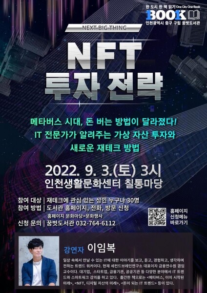 메타버스 시대에 새로운 재테크 방법에 관심 있는 성인을 대상으로 이임복의 ‘NFT 투자 전략’특강을 인천생활문화센터 칠통마당에서 9월 3일 오후 3시에 운영한다.