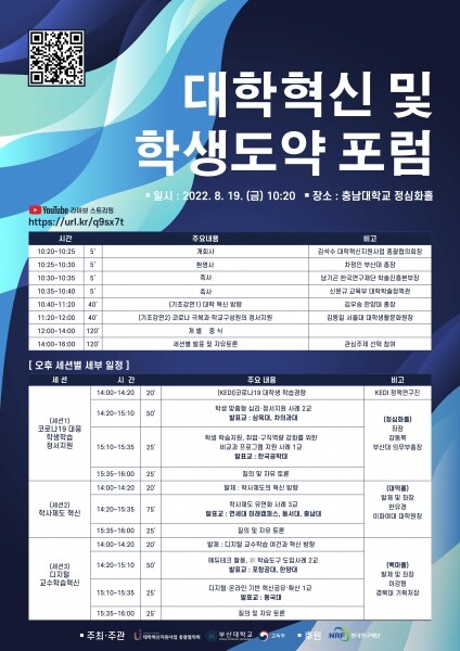 교육부는 대학혁신지원사업 총괄협의회, 한국연구재단과 함께 8월 19일 충남대학교에서 ‘대학혁신 및 학생도약 공개 토론회’를 개최하고 온라인으로 생중계한다.