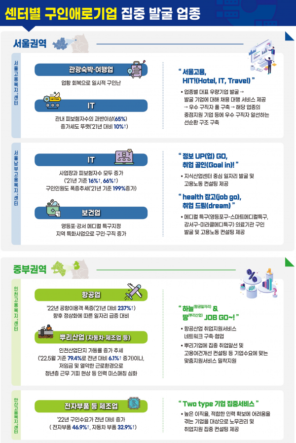 고용노동부는 현장 의견 수렴을 거쳐 전국 6개 권역별 총 11개 고용복지+센터에 전담팀을 구성했으며 기업 지원은 서울·서울남부·인천·안산·부산·대구·대구서부·전주·천안 9개 센터에서 구직자 지원은 서울·인천·부산·대구·광주·대전 6개 센터에서 제공할 예정이다.