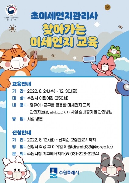 신청 서식 등 자세한 내용은 수원시 홈페이지 ‘수원소식→시정소식’에 게시된 ‘초미세먼지관리사 찾아가는 미세먼지 교육 대상 시설 모집’에서 확인할 수 있다.