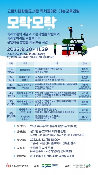 독서동아리 활동지원사업은 경기도가 주최하고 사회적협동조합 ‘슬슬’이 주관하며 고양시 화정도서관과 과천시 정보과학도서관에서 함께 진행할 예정이다.