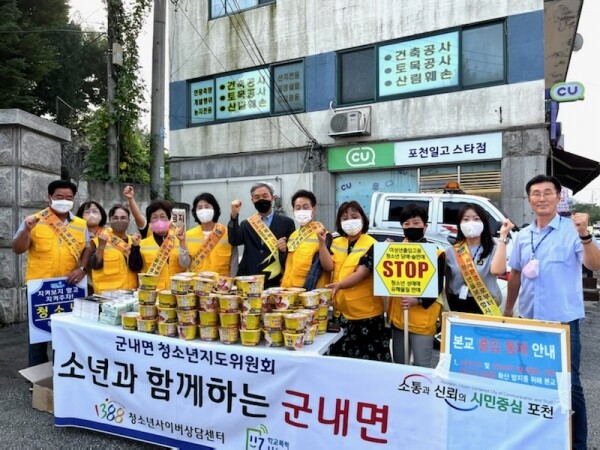 군내면 청소년지도위원 12명은 청소년들의 바람직한 생활환경 조성을 위해 포천일고등학교 정문 앞에서 ‘NO 담배, NO 괴롭힘, YES 아침밥’이라는 메시지를 담은 홍보물품을 배부하며 청소년들의 일탈행위를 예방하고 사회적인 관심을 촉구하기 위한 캠페인을 펼쳤다.
