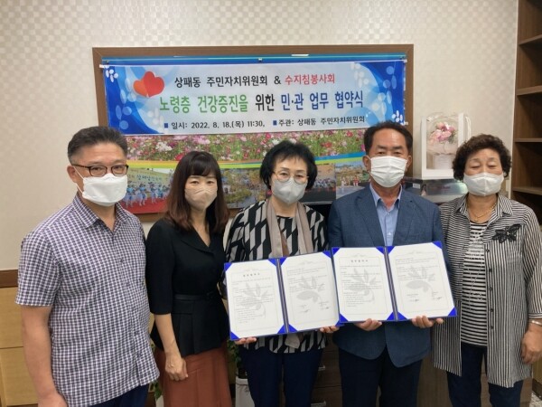 이번 협약은 상패동 관내 경로당 등을 수지침봉사회가 직접 방문해 건강지식을 전파하고 수지침 자원봉사를 실시해 어르신 건강증진에 기여하기 위해 상패동 주민자치위에서 적극적으로 추진한 것으로 알려졌다.