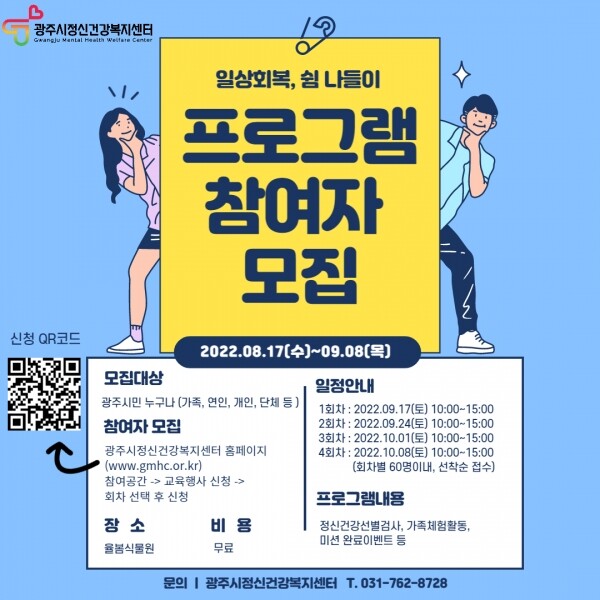 프로그램 참여 신청은 9월8일까지 광주시정신건강복지센터 홈페이지를 통해 누구나 가능하며 궁금한 사항은 광주시정신건강복지센터 로 문의하면 된다.