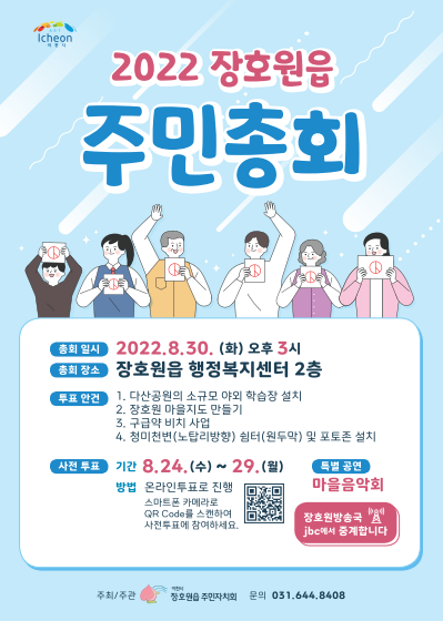 장호원읍 주민총회는 오는 30일 오후 3시부터 장호원읍사무소 2층에서 개최되며 2022년 주민자치회 경과보고 분과별 사업의제 발표와 현장 투표와 결과발표 순으로 진행될 예정이다.