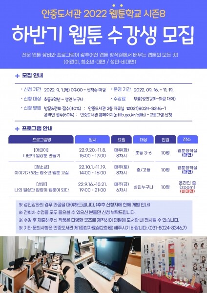 어린이와 청소년 강좌는 안중도서관 3층 웹툰창작실에서 대면으로 성인강좌는 직장인을 고려해 저녁시간 편한 곳에서 자유롭게 수업을 들을 수 있도록 비대면 온라인 줌으로 운영된다.