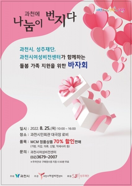 신계용 과천시장은 “이번 바자회가 지역 내 나눔문화 확산을 위한 좋은 기회가 될 것이라 생각한다”며 “판매물품을 후원해준 성주재단과 바자회를 주관하는 과천시여성비전센터에 감사드린다 많은 시민 여러분의 관심과 참여를 부탁드린다”고 말했다.