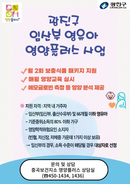 참여 희망자는 광진구 중곡보건지소 영양플러스 상담실로 유선 신청할 수 있으며 자격 평가 후 대상자로 선정된다.
