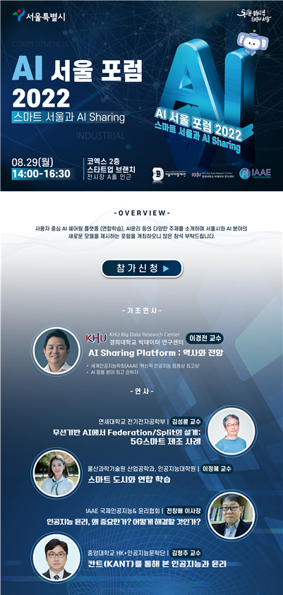 ‘AI 서울 포럼 2022’는 선착순 200명을 대상으로 사전 참가 접수를 받고 있으며 참석하지 못하는 시민들을 위해 포럼 영상은 추후 서울디지털재단 유튜브에 공개할 예정이다.