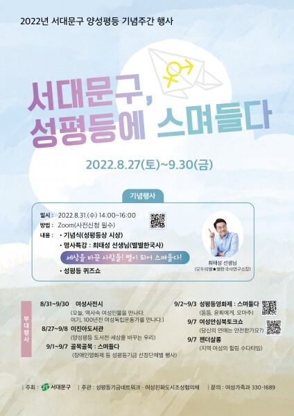 이성헌 서대문구청장은 “다채로운 문화 행사와 함께하는 양성평등기념주간을 통해 남녀가 서로 존중해 함께 행복한 사회로 한 걸음 더 나아갈 수 있길 바란다”고 말했다.