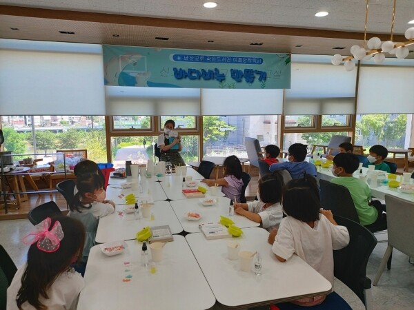 남산모루 작은도서관에서는 지난 8월 12일 6∼7세 유아 및 초등학교 저학년을 대상으로 “바다 비누 만들기”특강이 운영됐으며 파란색의 천연 비누 베이스에 본인 취향에 맞는 소라, 고둥, 물고기 모양의 비누 재료를 넣어 세상에 하나밖에 없는 나만의 비누를 만들어 보는 시간을 가졌다.